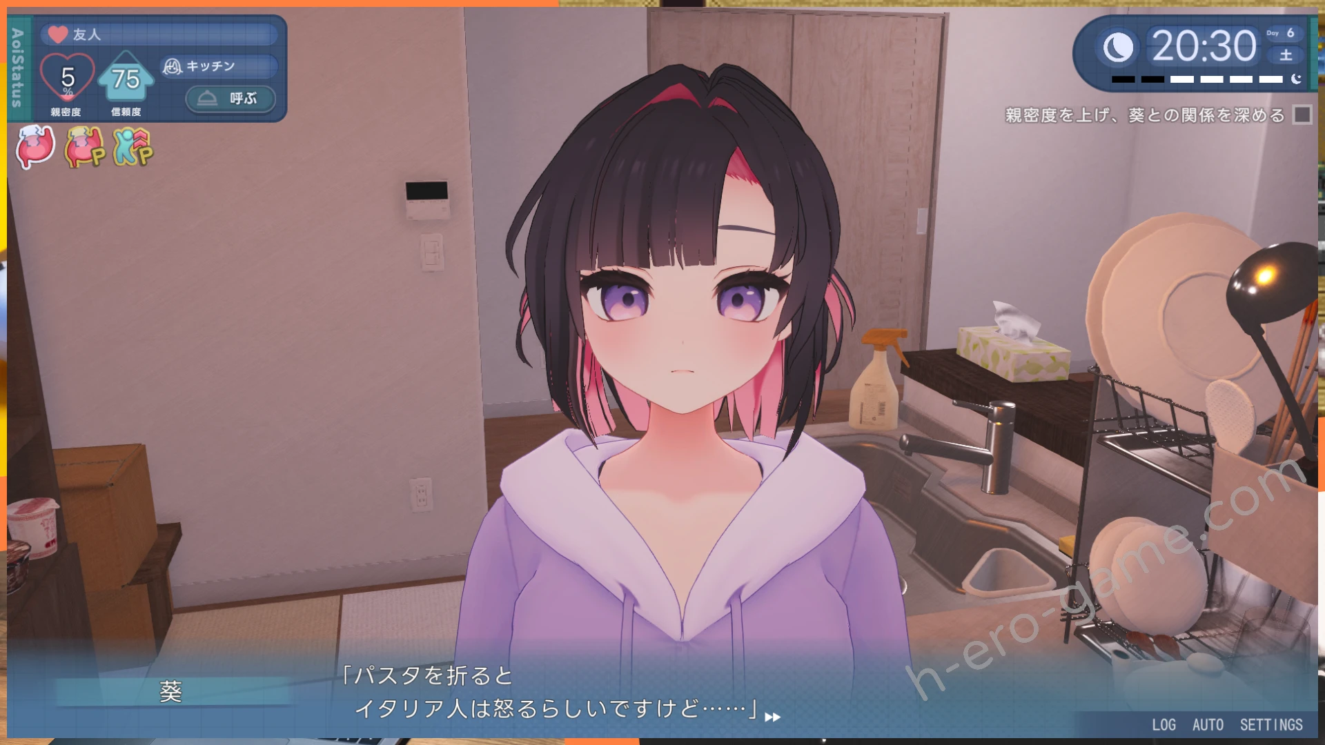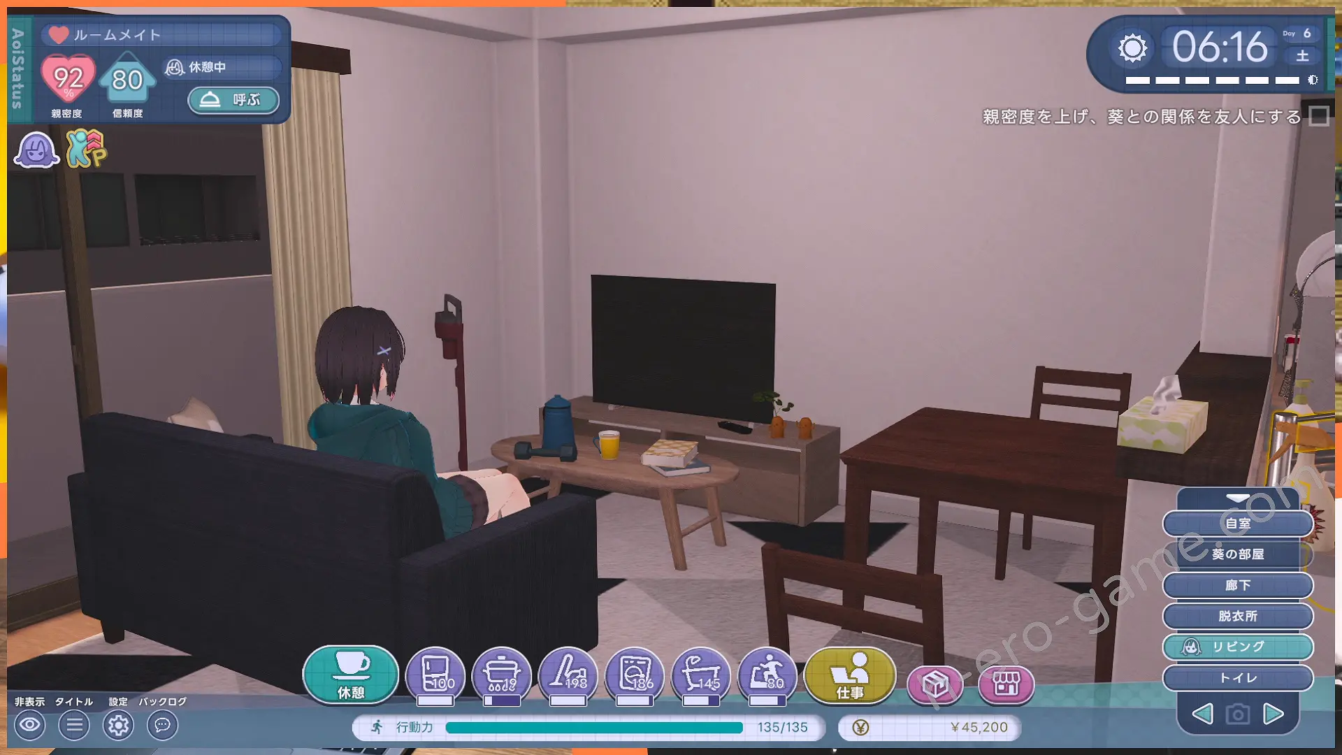 另一方面,女主本身也不是完全靜止的系統人偶。她有自己的親愛度、信頼度、心情(機嫌)、飽腹感、清潔、健康、體力、性慾等數值。表面上看起來有點複雜,但實際上她也會自己行動去維持狀態。有自己的作息與生理需求,會在家中不同地方活動,所以並不需要時時刻刻盯著她照顧。畢竟她也是成年人了,照顧自己並沒有問題。