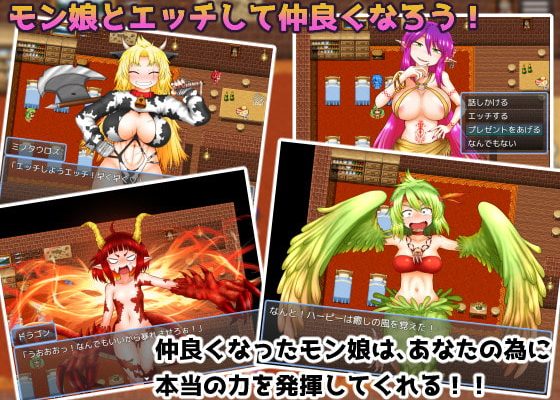 工口部分,雖然有些魔物娘因為個性的關係對H很害羞,而且設定上又是打倒魔物娘之後讓她成為夥伴,不過基本上都是和姦系的,另外還有瓜肚產卵的場景(可跳過)。送禮物提升好感也會解鎖新姿勢,對話也會從有點不情願變成親親我我的感覺。