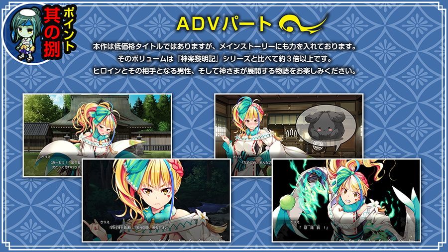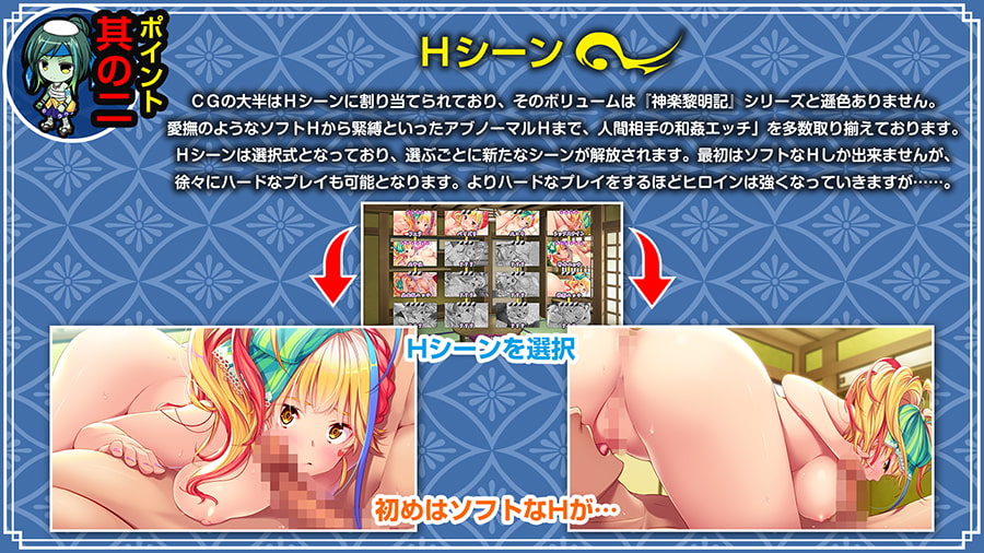 工口部分的話,是傳統的ADV模式,有全語音。之前有看過說「幽世ノ災厄ト現世ノ戦姫」這個系列會是純愛為主的情境,跟「神樂」系列的戰敗異種凌辱為主不同。總之巫女是凌辱,陰陽師是純愛,所以本作就算戰敗也只是保留經驗值回據點再打一次。主要的工口場景就是在據點時依序選擇各種陰陽調和的姿勢,雖然後面也有一點稍微過激的玩法,不過…是純愛。
