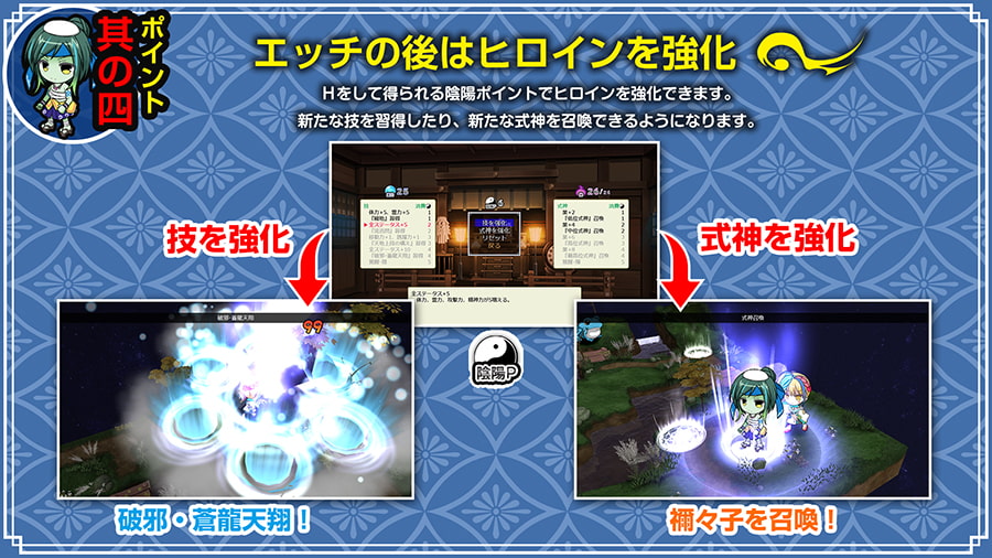 這款是「幽世ノ災厄ト現世ノ戦姫」的續作,遊戲系統上是很正統的迪波之巢系的SLG,這玩法大概是夏神樂(大概啦)開始就一直流傳下來了,不過還是為完全沒玩過迪波之巢系列遊戲的玩家說明一下。遊戲的部分分成據點與戰鬥這兩部分,在據點時修整、用陰陽之力點技能、購買道具還有最重要的H獲得陰陽之力。