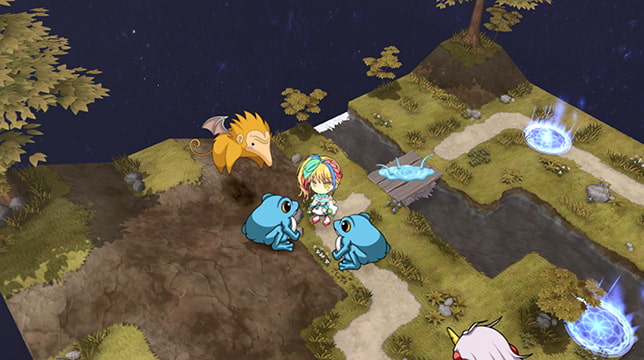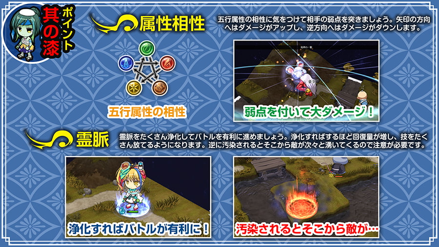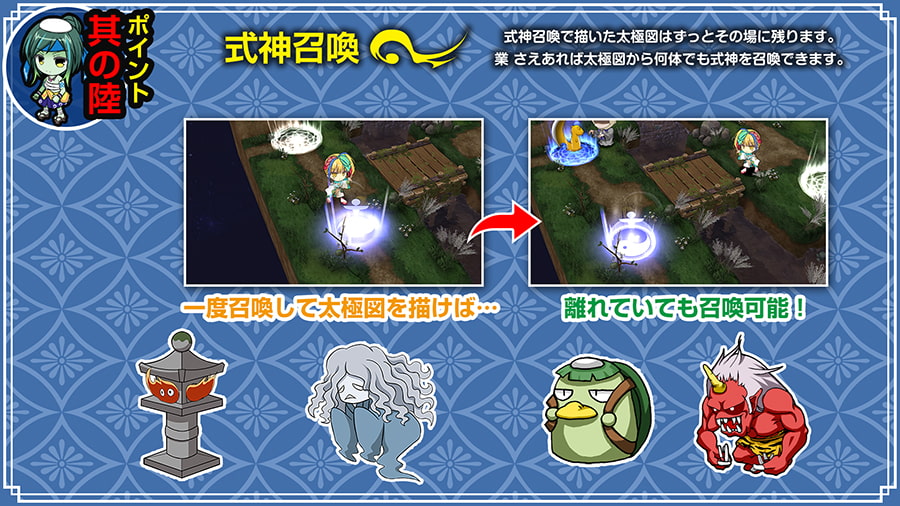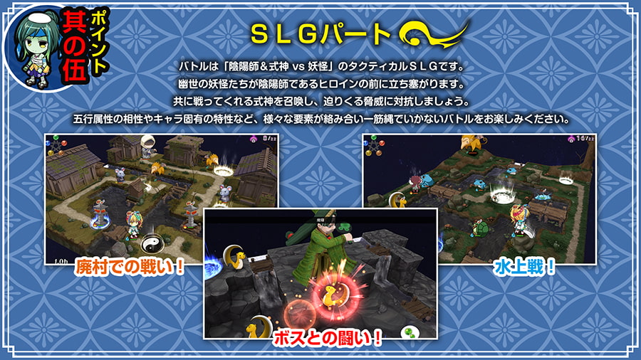 然後戰鬥的部分是戰棋型的SLG,大致上來說還是蠻傳統的戰棋,不過迪波之巢系戰棋的特色是式神招喚跟靈脈系統。以本作來說的話,一開始參加戰鬥的只有女主,可以使用業力來招喚式神增加夥伴。而式神們有各自的技能與特性,像是河童在水中的移動速度很快,小豆洗很愛乾淨所以不會中毒之類的。不過不用練這些式神,他們會與女主一起成長,在女主的等級提高時式神也會得到新技能。
