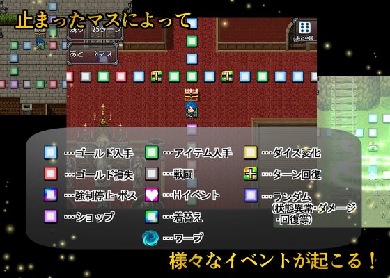 遊戲部分是雙六型的RPG,大致上就是擲骰子並按擲骰數前進,在停止的方格中獲得物品或是進行戰鬥。通常的遊戲戰鬥是使用攻擊和技能來完成,不過勇者在戰鬥中還是擲骰子,攻擊的種類根據擲骰數決定。所以……就是把命運完全交給骰子。